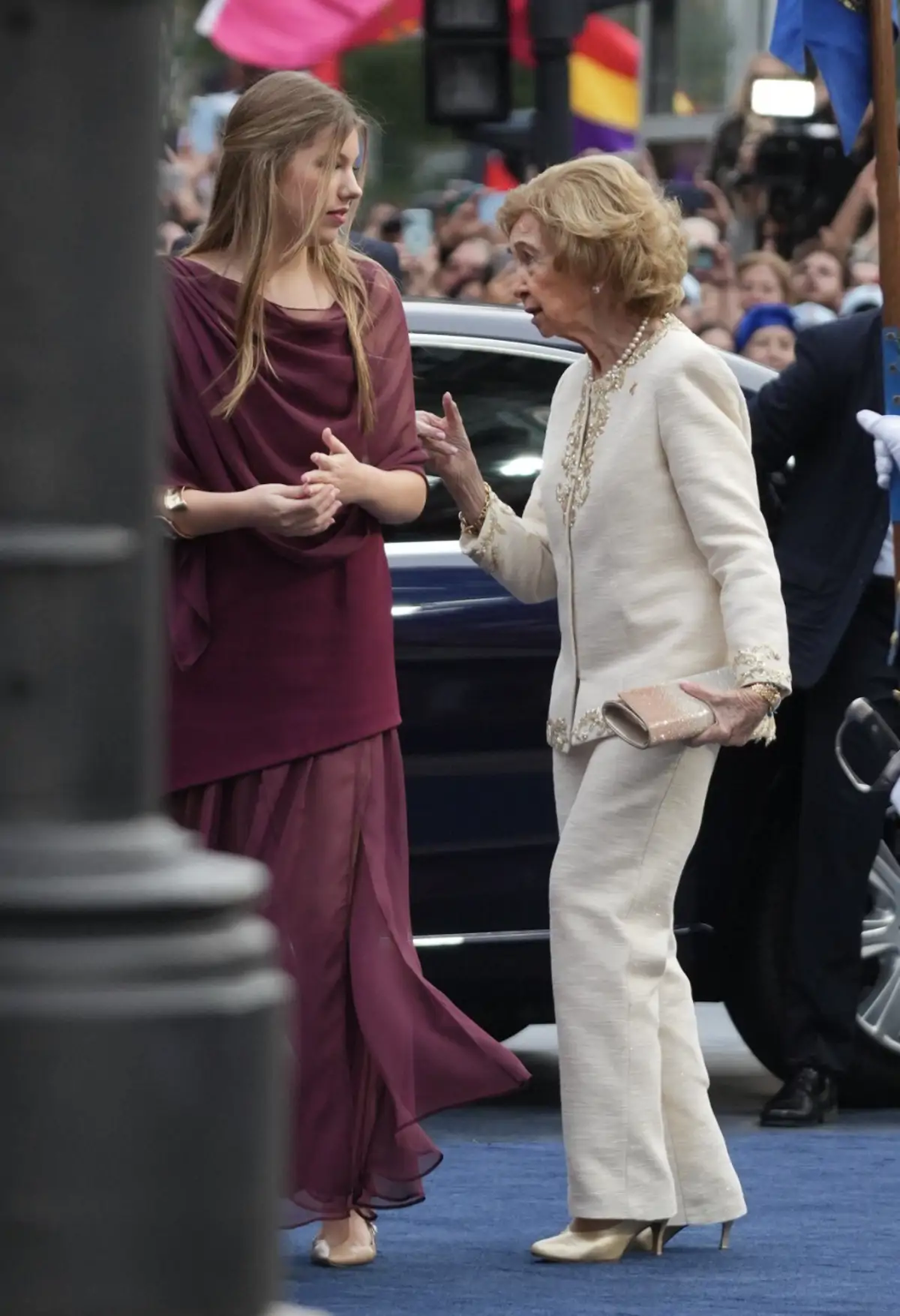 Algo desorientada, se cruzaba por delante de su nieta Leonor mientras esta iba a saludar a los presentes.